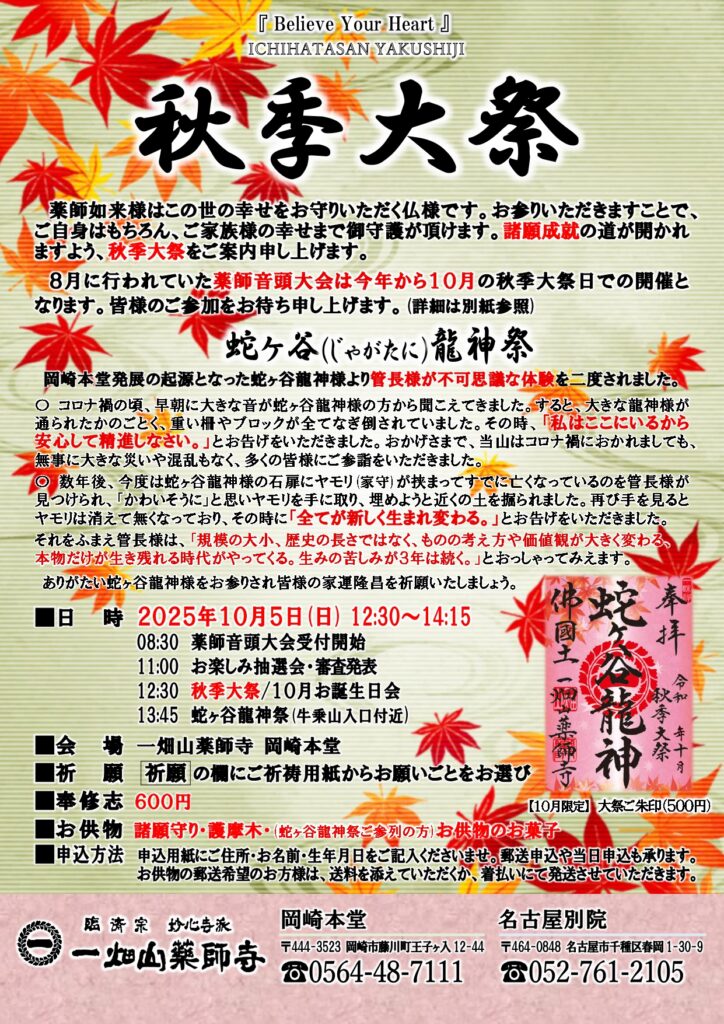 また今年から10月開催となった薬師音頭大会が午前中に行われます。秋季大祭の開催時間は12:30~になりますので、お間違いないようよろしくお願い申し上げます。