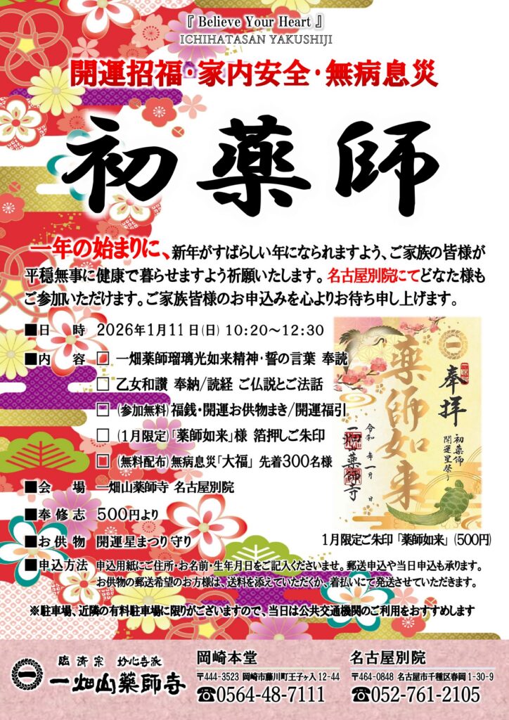 1月の「初薬師」では、1年の始まりに新年の開運招福・家内安全・無病息災を祈願させていただきます。1月11日(日)10時20分より名古屋別院で行います。