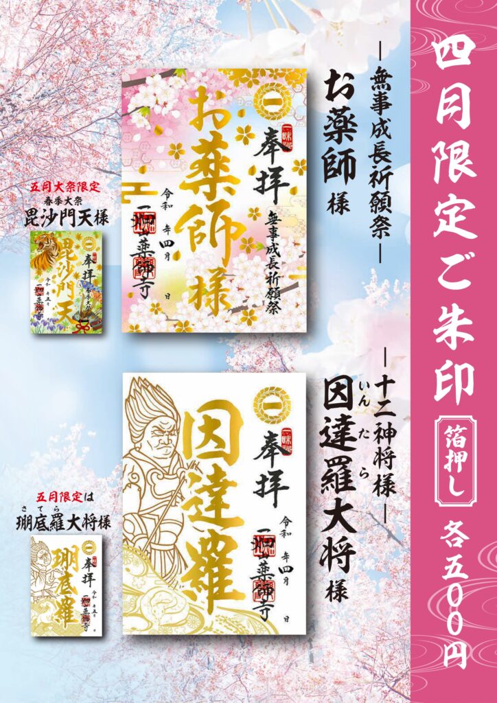 一畑山薬師寺では月替わりのご朱印を毎月2枚お分けしています。一つは毎月の大祭にあやかったもので、今月は“無事成長祈願祭”から4月の桜をモチーフにした「お薬師様」のご朱印です。